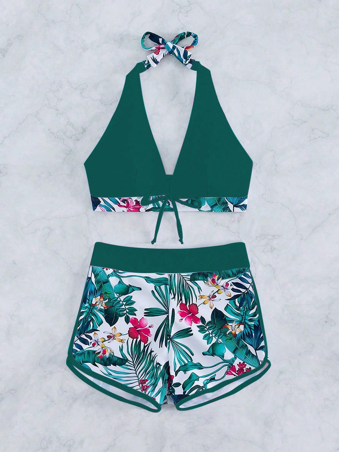 Desfrute do verão com o Biquíni Halter Box, um conjunto de duas peças que oferece o charme tropical combinado com conforto inigualável. Com uma estampa tropical encantadora e detalhes de nó, este biquíni apresenta um estilo moderno e elegante.